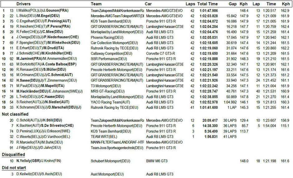 Zum Samstags Qualifying konnte die Mercedes AMG Mamba des Landgraf Teams mit Raffaele Marciello und Daniel Juncadella sich den ersten Platz und damit die Poleposition sichern. Die Bestzeit von1:17.878 wurde zur Mitte des Qualifying gefahren. Dahinter qualifizierte sich das Fahrerduo Schiller/Gounon mit dem Drago AMG Mercedes mit einem Abstand von 0.112. Kim-Luis Schramm und Dennis Marschall auf dem Rutronik Audi R8 sicherten sich den 3. Platz mit einer Rundenzeit von 1:18.260.